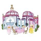My kids received basically this same product for Christmas. However, this must be an updated version... theirs doesn't have the cute water fountain, the ornamental bushes, the windows and many other details. The interior is a flat teal color, and the entire "palace" appears to be much cheaper put together than the photos shown of it. So beware, what you pay for might not be what you get, and this was bought at one of the major big box brick and mortal stores. The princesses are two of the usual suspects, Belle and Aurora, but with big fancy floppy hats and the cloth clothes. This was released before the better snap-on plastic dresses came out unfortunately, so they cannot stand (as the plastic dresses aid the dolls in standing up. The dolls can sort of sit in the chairs with some careful manipulation, but if you have bought other mini Disney playsets such as the Moments series, this is no surprise. The "tea party" aspect is pretty much wasted, since the tea set for mini dolls this size are so tiny they are nonexistent. A vacuum can easily suck up the teacups without anyone even noticing. They were so small I was afraid the dog would inhale them, sniffing at the toy. Now that's tiny!My kids have been pleased with their Tea Party Playset and have played with it quite a bit though. The disappointment only set in when we saw pictures of what the set could have looked like, which is similar but much fancier than what was in the box.