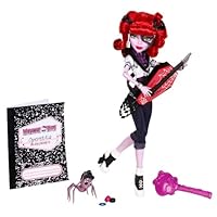 I've posted a couple other reviews, and as I've said in the past, Mattel has stepped it up a notch on the design quality of the newer MH line of dolls. I just scored Operetta and Nefera today at Walmart, for 18.97 each. Keep your eyes open, they are just now reaching store shelves and they are more plentiful than you think. But make sure to jump on it quickly, they'll get bought up fast! And no doubt by these greedy toy resellers!! Call your local Walmart and Target stores and see if they have them in stock. As for my review of Operetta, well, I'd say she is my favorite doll in my collection. The color of her skin is purple, and her hair is red with black streaks, done up in pinup/rockabilly style. She has a big heart mask over her left eye to help hide the "scarring" on the left side of her face and yes she actually does have scars etched into the left side of her face! She is wearing two different earrings but they are each dice, one black, one white. She has tattoos down the left arm. Her outfit is cute, with cuffed capri jeans and a cute little rockabilly style top. Her accessory is a guitar shaped like a coffin with a big spiderweb painted on it. Her pet is a spider with a pompadour, and he is using one of his legs to comb it! So far, I think she is the most detailed, well thought out doll of the bunch. You will not be disappointed with this one! Good luck in your endeavors to find her, and DO NOT pay over retail price!