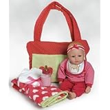 I bought this for my little girl to play with (yes I know it's a collectible!) it's very realistic and that's the type of doll that I want. It has a beautifully crafted head and sweet face with real eyelasheshowever, her eyes do not open and shut. Also, if you do get this for your girl to play with, the eyelashes do come off easily. The doll looks exactly the way it does in the picturewhich is nice since it doesn't always look as good in person. She has a bean bag stuffed body which gives her a nice heft. Hands and feet are vinyl. She is not tiny but a great size for girls to play with. All of her accessories are included as shown in picture. The blanket is super soft and my little girl loves to bundle her up. This is one of her favorite dolls :) great purchase and we got it at such a good price. Definitely recommend.