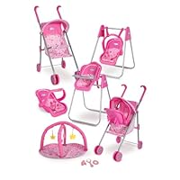 I was kind of disappointed by the quality of this set. It is very junky and flimsy but my 18 month old daughter does have fun with the car seat and stroller. Picture is mis-leading because it doesnt actually come with a seperate high chair or swing. It comes with the stroller the carseat and the frame that doubles as a highchair and swing by attaching the car seat. Very stupid design and falls over when my daughter tries to put a doll in it (the "highchair" and "swing") even if its one of her smaller ones. The play gym is also not as nice as the picture, it is misshapen and pointless. She is only 18 months right now so i guess she doesnt know any different but I have been looking to upgrade to better quality accessories since I opened this package!!! in my opinion you can get better quality for your money!!