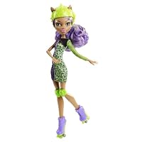 This is a pretty cool looking Clawdeen. Her hair is straighter than usual with just a slight amount of curl. It is mostly medium purple/lavender with green streaks (every roller maze doll has some green in their hair, it ties the dolls together nicely in my opinion). Her hair is all one length and pulled into a side ponytail to the left side of her head. Her facepaint is exquisite. She has streaks of gold luminous glitter on her browbones and a light green/gold on her eyelids and lining her lower eyes. Her lips are a goregeous light cotton candy pink. She wears a mini dress that is mostly lime green leopard print down the left side of the dress with the right side being black with purple ribbon accent. There is a long lime green mesh sleeve on the left side of the dress only. Her kneepads are solid lime green. Her helmet is also lime green with a leopard print molded all over it and a line of spikes running straight down the middle on the top of the helmet and also across the chinstrap (which is functional)....so cool. Her skates are purple on the top with a spiked cuff and spikes across the instep with a lime green sole that also features a spike motiff. The wheels on her skates are different colors and configured as follows: Right skate..lime green wheels up front, charcoal grey on the back, left skate is reverse: charcoal grey wheels in the front, lime green in the back. She has no jewelry at all. She does come with a stand that is the same color lime green as her helmet and pads, however she does not have a brush. She also comes with a cardboard insert that shows a closeup of her face on the front, and shows her, frankie, lagoona, and operetta on the back. The Roller Maze dolls are awesome and this one is no exception.